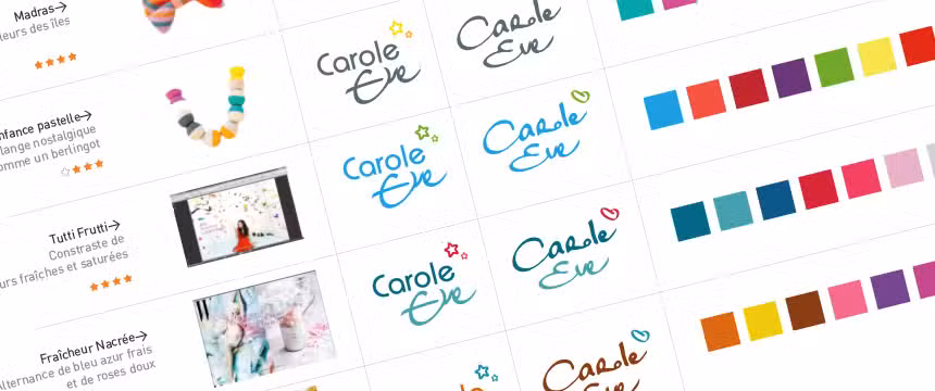 Ce choix de couleur s’est affiné par un jeu d’aller-retour avec Carole-Eve, pour parvenir au nuancier ci-dessus, empreint de beaucoup de vivacité, et avec une belle coloration acidulée comme le désirait la cliente. Ces couleurs serviront d’ailleurs le site internet et son habillage.